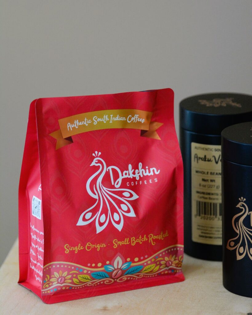 We are launching 8oz and 12oz bags, along with 8oz tins. Packaging has been a true labor of love, and we are incredibly proud of how the designs have come together. The colors reflect the bold and smooth tasting notes of distinctive South Indian coffees sourced from Andhra Pradesh, Karnataka, Kerala, Tamil Nadu, and clusters of micro-lots throughout the southern regions of India.
